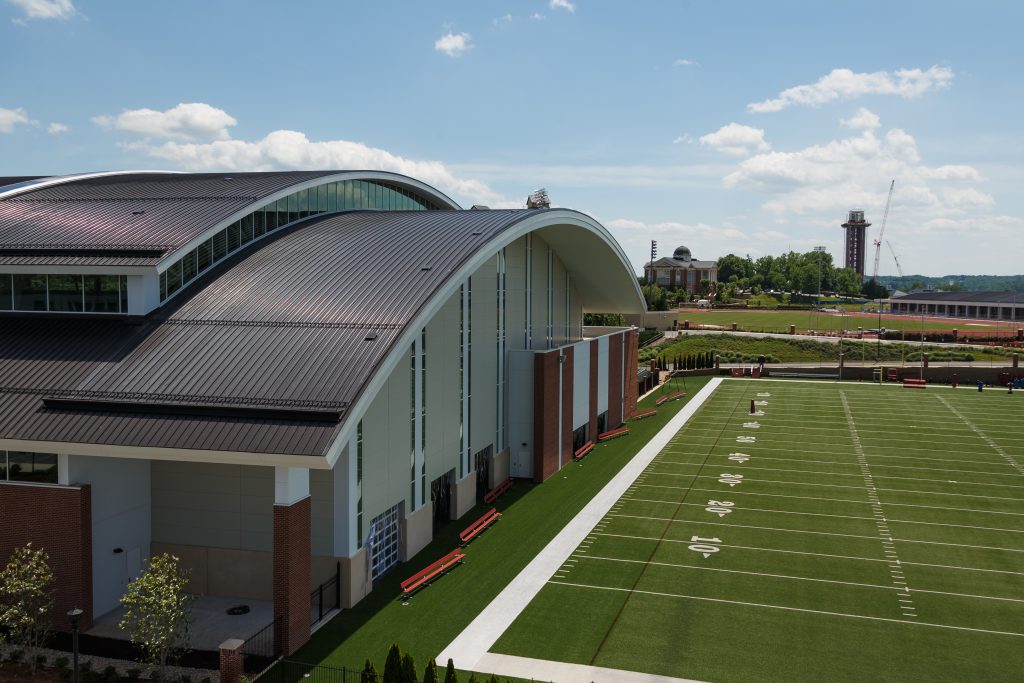Falwell announced plans for the state-of-the-art indoor practice facility just two years ago. The design by Liberty University and VMDO Architects called for a 70-foot dome ceiling with clearance for booming punts and kickoffs, along with a full-size AstroTurf practice field. Of course, the benefit of an indoor practice facility is the team’s ability to take the field despite inclement weather. The designers at VMDO turned to an insulated metal panel (IMP) system by Metl-Span to meet the all-weather performance requirements.