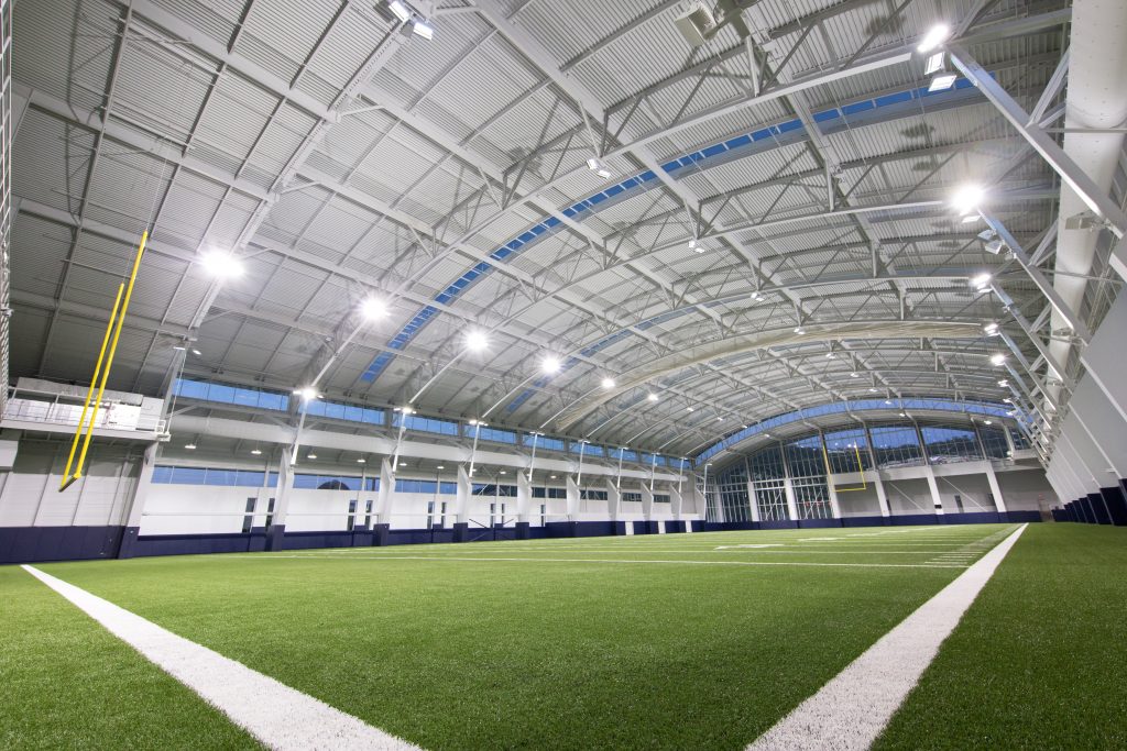An insulated metal panel building envelope facilitates football practice in all weather conditions.