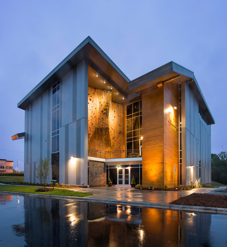 Approaching the new Cliff Hangers facility in Mooresville, N.C., visitors are greeted by climbers scaling an outdoor climbing wall directly above the front doors.